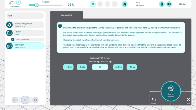 The Change weight command can be used to change the weight stored in the programme (Start/Configuration) for the subsequent waypoints. This only applies to waypoints that do not have a separate weight stored.
