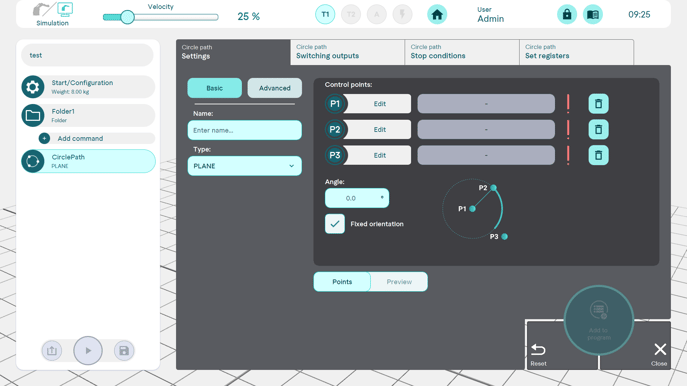 P1 forms the centre of the circle. P2 is the starting point of the circular movement and the length of the distance P1P2 thus determines the radius of the circle. Finally, point P3 defines the plane of the circle. The orientation of the effector at the start of the circular movement is given by P2. If a "fixed orientation" is selected, the orientation remains constant during the circular movement, otherwise it can change." (The orientations of P1 and P3 are ignored.)