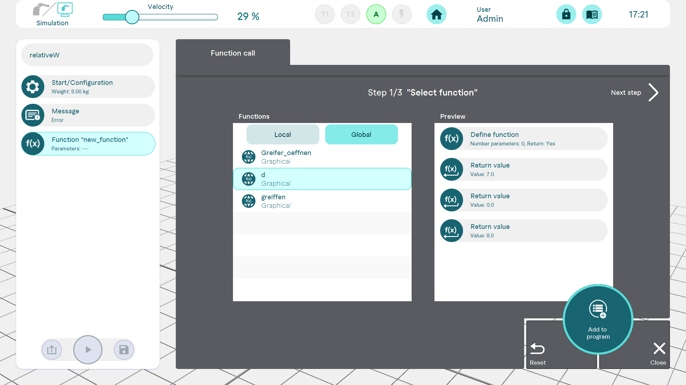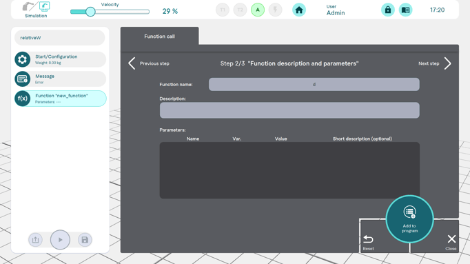 In the second step, more detailed information about the selected function is displayed. The parameters defined in the function are listed. The value of the parameters corresponds to the respective default value and can be changed here. Alternatively, a variable can be selected here whose value is adopted as the parameter value. These parameter values are transferred to the function when it is called.