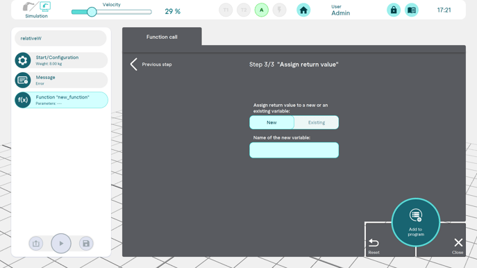 The last step determines whether the return value of the function is assigned to a new or an existing variable. If the option New is selected, a valid variable name must be entered; if the option Existing is selected, an existing variable must be selected.