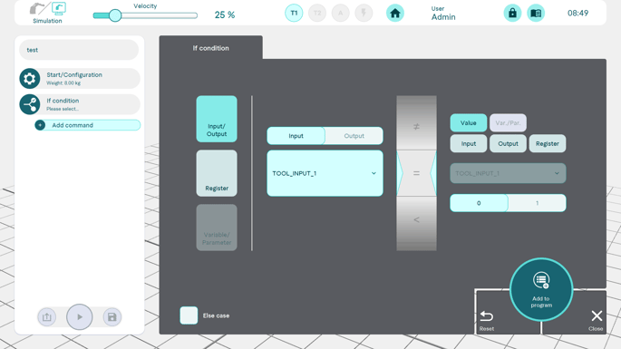 The If-condition command can be used to combine commands that are only executed during programme execution if a correspondingly defined condition is met. If this is not the case, all included commands are skipped or only the commands in a possibly added else-case are executed.