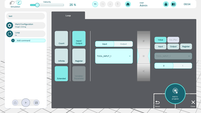 The Loop command creates a repeat loop in the programme. Any number of commands can be added within the repeat loop. The repeat loop executes its content until its condition is no longer fulfilled. The condition is checked before each loop run.