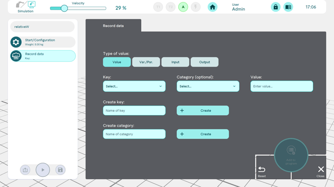 To record a process data entry, a key must first be created. This key can optionally be assigned to a category. As a value for the selected key, either any value can be entered via the keyboard or the value of a variable/parameter, an input or an output can be set.