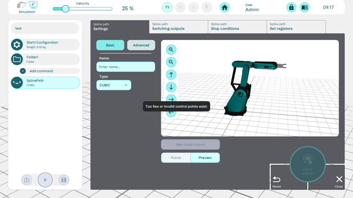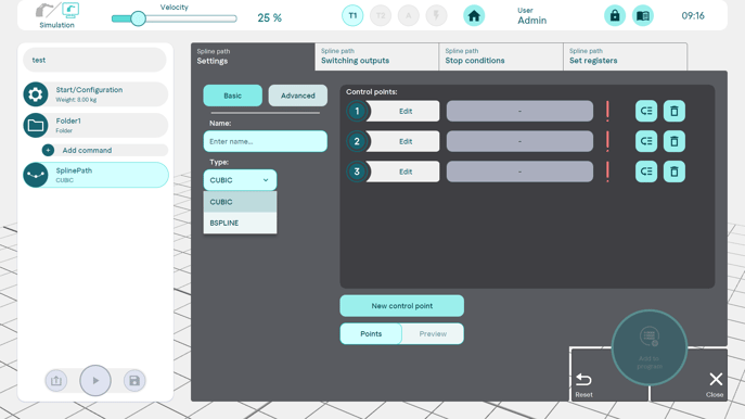 With the spline path command, it is possible to execute a movement based on a defined curve, which is advantageous for avoiding collisions or for gluing applications, for example.