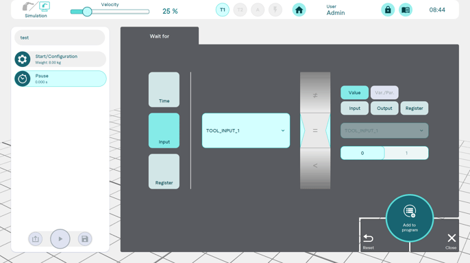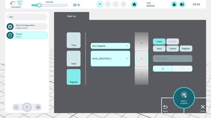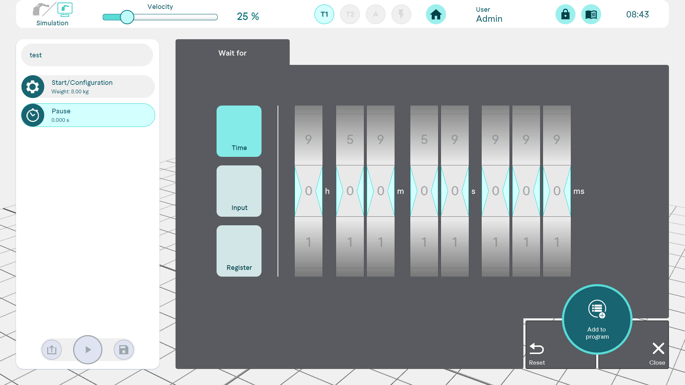 A period of time in hours/minutes/seconds/milliseconds can be defined between two commands during which the robot stands still.