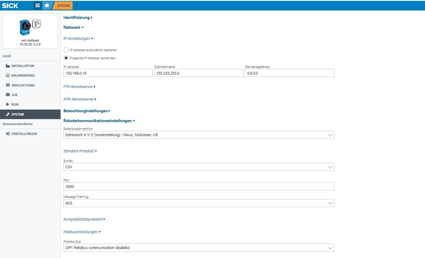 Here is an example of how to configure the IP address and robot communication settings on the SICK PLOC2D camera. The CSV protocol was used for this purpose.