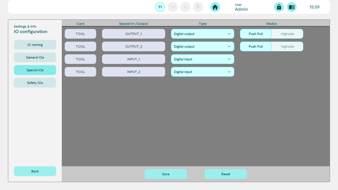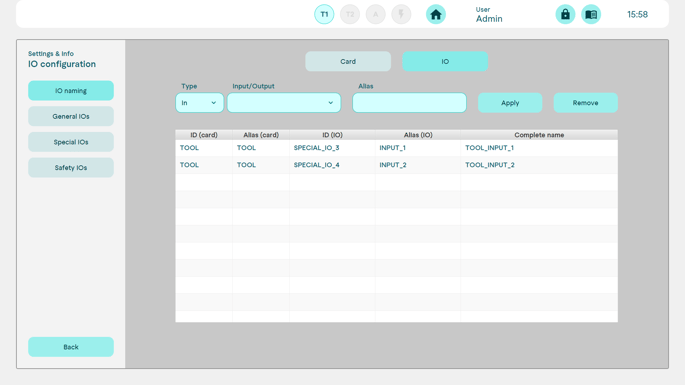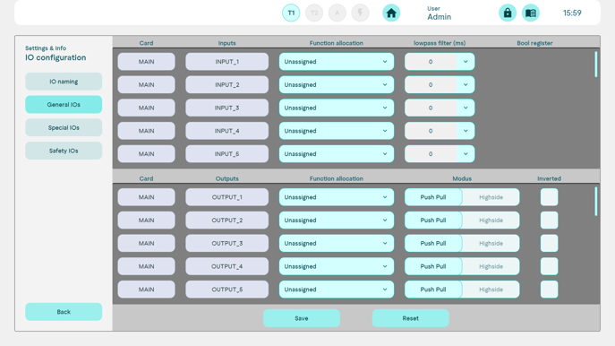 In this settings menu, it is possible to set and configure all settings relating to the I/O cards and the various inputs and outputs.