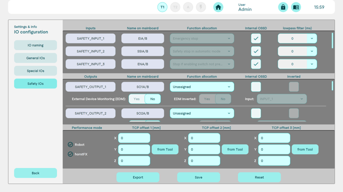 In the Safety I/O submenu, the safety I/O can be configured using various setting options. Functions can be assigned and set and internal OSSD can be activated.