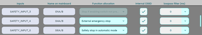 If the internal OSSD test signal is used, meaning if the safety signal TA/TB is connected to terminal X4, then the checkbox for this must be enabled (Yes). In this case, the low-pass filter is not necessary to avoid filtering out the signal.
