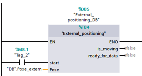 The FB is assigned a data block (DB5) in which the local variables are defined. The FB has two input variables. The FB is executed via the Boolean input variable "start", which is controlled here via a simple switch with flag bit assignment. The TCP coordinates are transferred at the "Pose" input. The required data structure is predefined in a global DB: