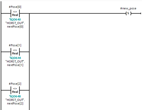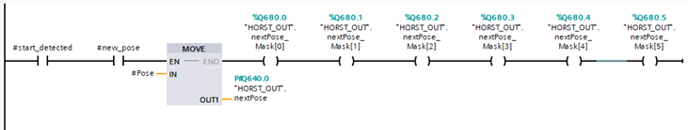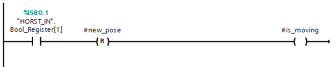 This checks whether the current pose has been transferred to CONTROL and whether the robot is moving (#is_moving). For this purpose, a Bool register is read out on CONTROL ("HORST_IN".Bool_Tegister[1]), which is set in horstFX after the pose has been read in and before the movement is started. If this status bit is set, #new_pose is reset and #is_moving is set. When the pose is reached, the status bit in horstFX is reset and the PLC is notified that the pose has been reached (#is_moving=false).