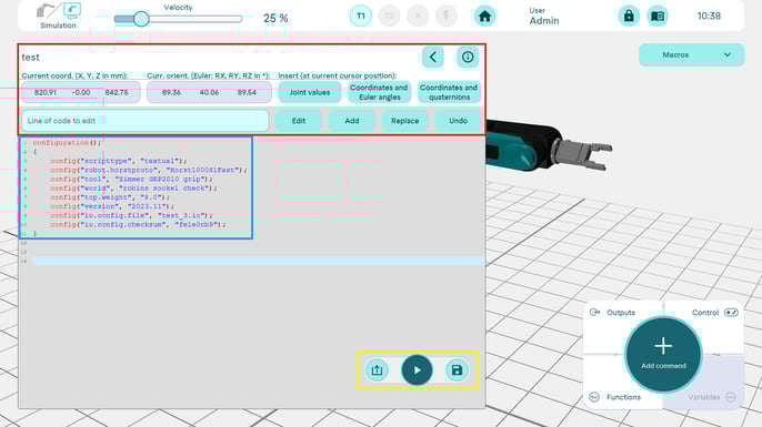 The red box shows the programme name and the current TCP position of the robot. There are also buttons that can be used to insert the corresponding values (in a specific format) directly into the text editor. Clicking on the i button at the top right opens a help window in which all textual commands are briefly described.