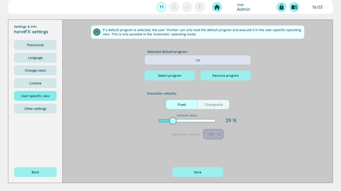 The programme to be used in the user-spec. view can be set in the Settings & info > horstFX settings > User-spec. view menu. Additional speed settings are also possible there.
