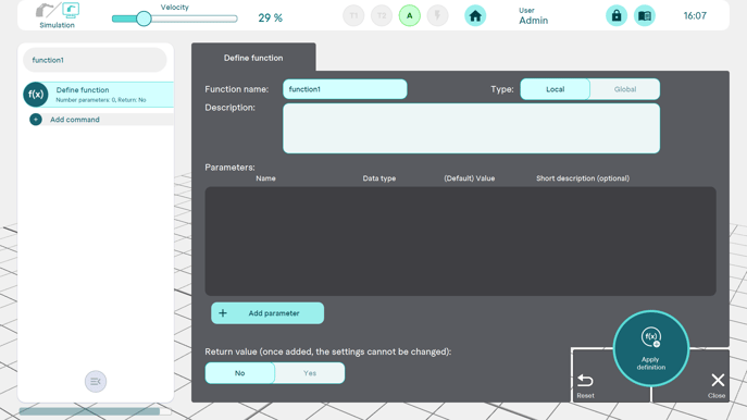 Functions can be created in any programme. By tapping the Functions button next to the Add command button, a a graphical or textual function can be created. Before programming the function, it can be defined as global or local: global functions can also be used in other programmes, local functions cannot. Transfer parameters and return values can also be added.