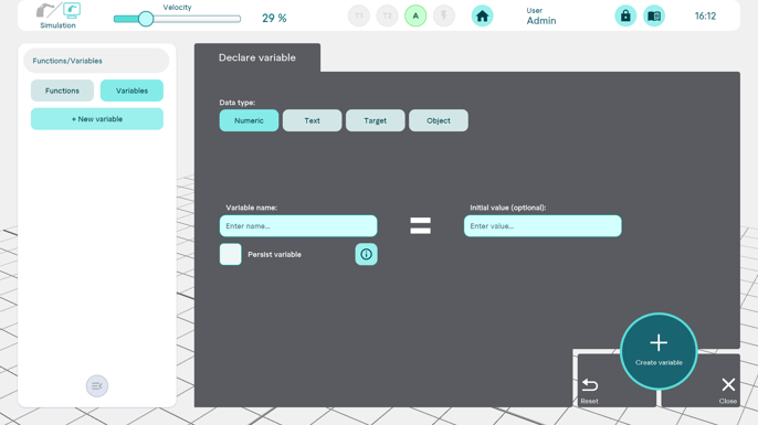 A variable can be created by tapping the Variables button and then +New variable. Possible data types are numeric, text, target position, object.