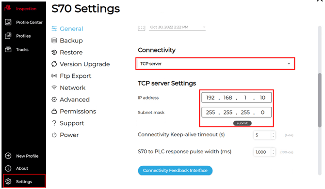 Setting up the Inspekto system is clearly detailed in the accompanying documents provided by Inspekto. The software also guides users smoothly through the setup process. For TCP/IP communication, the Inspekto software requires selecting 'Connectivity TCP server'. Subsequently, the camera's IP address needs to be aligned within the same range as the robot's. This means the first 3 blocks of digits must match those of the robot, while the last block must be distinct. The robot's Control cabinet is connected to the Inspekto system's PLC network socket via a network cable.
