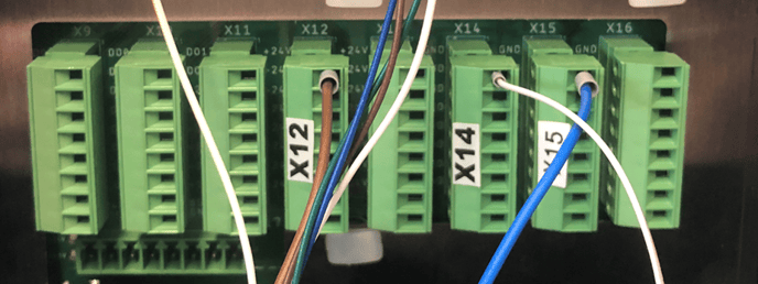 The PowerOut 24V connections on X12 and X13 can be used for the supply voltage in the same way as when using only one safety scanner. The terminals on X14, X15 and X16 can be used for the GND ground. The connection of the signals is shown in the following illustration.