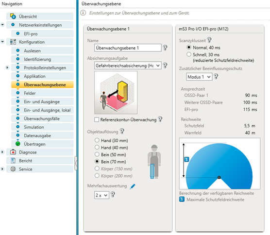 - Definition of the monitoring level. Depending on the setting, the values influence the required safety distance (see BA SICK and standards EN ISO 13855 and 13857).