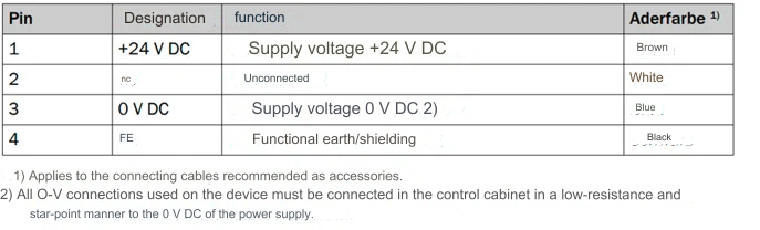 The assignment of pin, designation, function and wire colour can be found in the connection table (see table below). This requires the use of standard cables from SICK (type: YN2A1D-100UV1XLEAX, item no.:2118011, https://www.sick.com/de/de/yn2a1d-100uv1xleax/p/p671027).