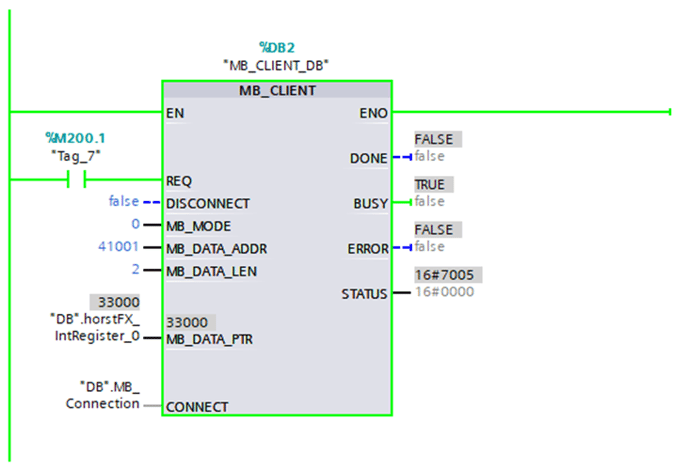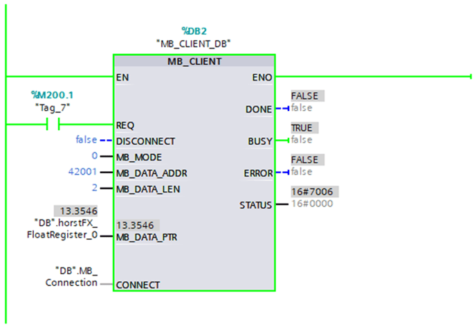 The MB_CLIENT function block is used to read two words (4 bytes) from the Modbus registers.