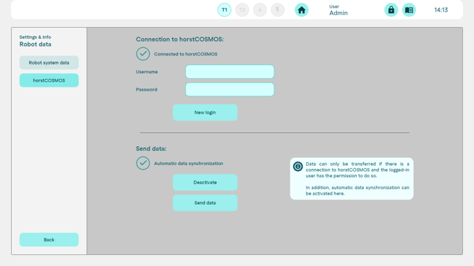 In the horstCOSMOS menu, a connection to horstCOSMOS can be established by logging in and data can be transferred to horstCOSMOS.