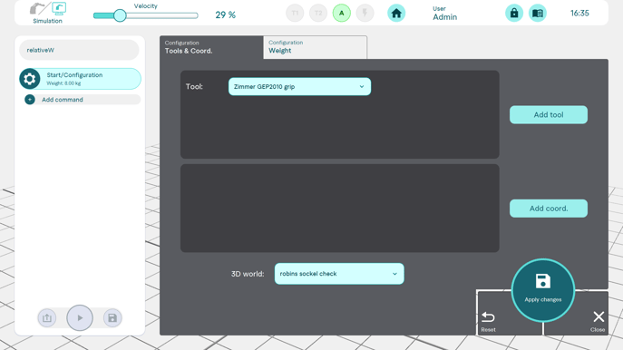 The weight configured here on the robot flange (tool + workpiece) applies programme-wide for all Waypoint and Relative Waypoint commands, unless it is overwritten by a Change Waypoint or a separate weight is configured in a Waypoint or Relative Waypoint command.