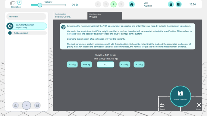 The maximum weight on the TCP should be determined as precisely as possible and set here. If the weight specification is too low, the robot will be operated outside the specification. This can lead to increased wear and possibly to step losses and thus to damage to the system. Operating the robot outside the specification will invalidate the warranty.